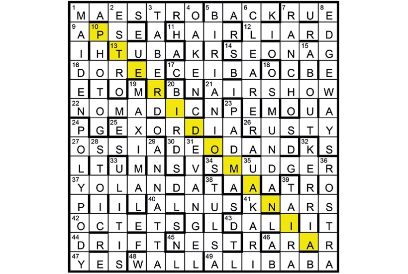 The unclued lights are ferns: RUSTY-BACK (26/5A), WALL RUE (48/7A), MAIDENHAIR (1D/11), OSMUNDA (18), BIRD’S-NEST (20/45) and POLYPODY (24). PTERIDOMANIA (diagonally from 10) could have induced this puzzle and was to be shaded.