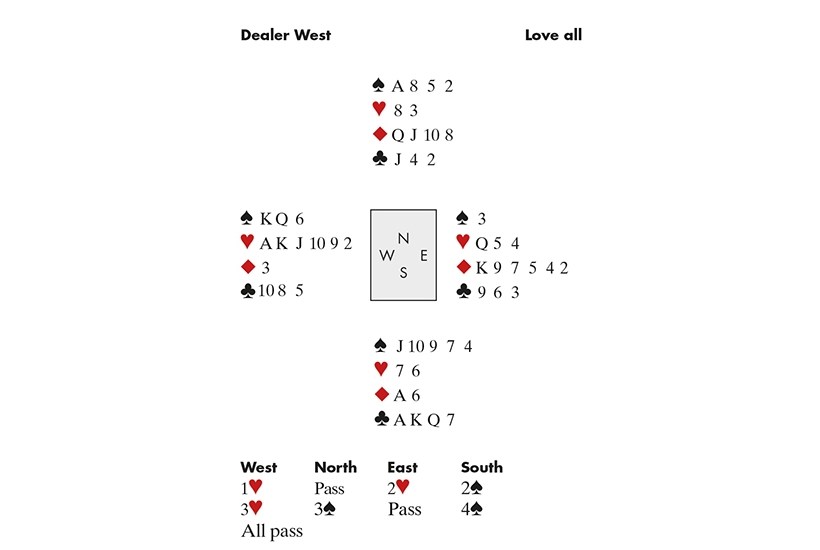 Accordingly Justin crossed to the ♣A to lead the ♠J from hand, covered by West and won by Dummy’s Ace. Now another spade would have been fatal. West would win and, guided by his partner’s carding at tricks 1 and 2, would know to cross to the ♥Q to get a diamond ruff for one down. But declarer saw this coming. Placing West with just one diamond it was likely he had the missing high and low spade. The solution? Justin played a club to the Jack, and another back to hand. When West followed, he continued with the master ♣Q; West was forced to trump this or the heart would disappear from dummy, but now all the defence made was 3 tricks in the majors. .