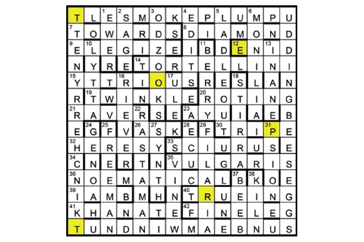 CHERRY, NETTLE, SMOKE, PLUM-PUDDING, BEES, EGG, SUNBEAM and WIND are the perimetric answers to riddles posed by NUTKIN in The Tale of Squirrel Nutkin by Beatrix Potter. Nutkin’s brother is called TWINKLEBERRY (19/11) and Nutkin is a SCIURUS VULGARIS (33/35A) (red squirrel). Shaded squares give the letters of POTTER.