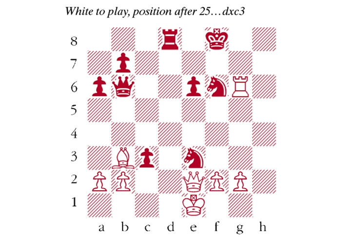 1 c4 e6 2 d4 d5 3 Nc3 c5 4 cxd5 exd5 5 Nf3 Be6 6 Bf4 Nc6 7 e3 a6 8 dxc5 Bxc5 9 Ng5 Nf6 10 Nxe6 fxe6 11 Bd3 Bd6 12 Bg3 Bxg3 13 hxg3 Ke7 The preceding exchange of dark-squared bishops has made this square relatively hospitable to the king. 14 Qe2 h5 15 Rd1 Ne5 16 Bc2 Qb6 17 Bb3 Rad8 18 Rd4 Nc6 19 Rdh4 When the king remains in the centre, such eccentric measures to coordinate the rooks are justified. 19…Ne5 20 g4!? Clever. 20…Nexg4 21 Rxh5 Rxh5 22 Rxh5 Nxe3 22…Nxh5 23 Qxg4 Rh8 24 Qh4+ and g2-g4 regains material 23 Rg5 d4 24 Rxg7+ Kf8 25 Rg6 dxc3 (see diagram)