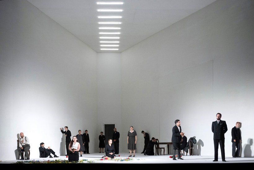 In this case, it’s a German Romantic sound-world of baleful clarinets, hunting horns and low, surging string melodies that (at least to the sensibility of an Italian opera composer in the 1840s) makes a perfect fit for the Tyrolean setting of the opera’s source, Schiller’s play Kabale und Liebe. It was also the principal source of colour in Christof Loy’s production, which moves the story into the present day and locates it inside a vast empty white box, with the cast dressed in varieties of black and white formal wear. There are exceptions. Federica — a character who remains at one remove from most of the action — wears a peach-coloured ballgown, and as the opera opens Luisa is asleep on the floor while villagers scatter cut flowers on and around her. It’s a reference, though we don’t yet know it, to her Act III description of death as ‘a bed strewn with flowers’.