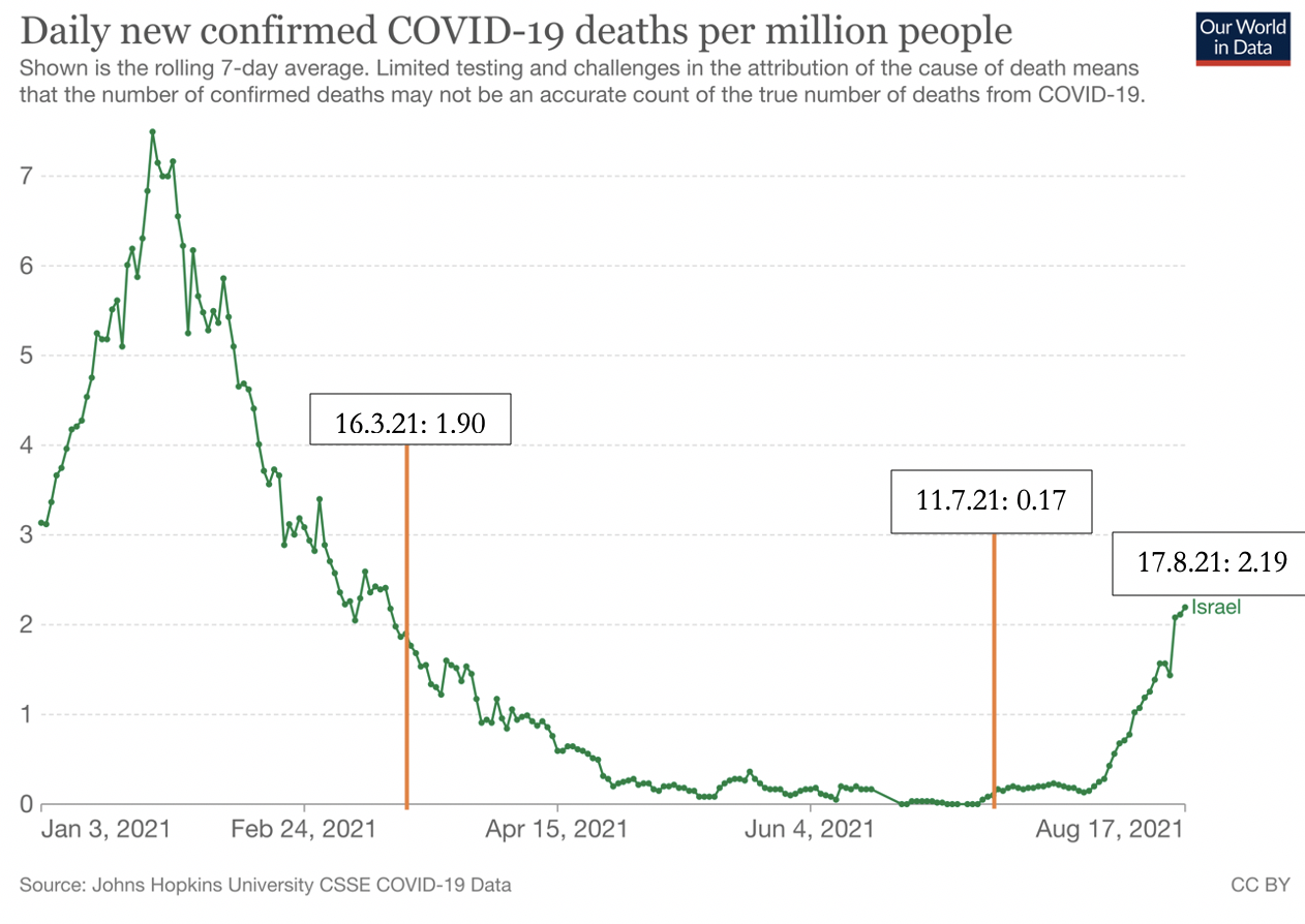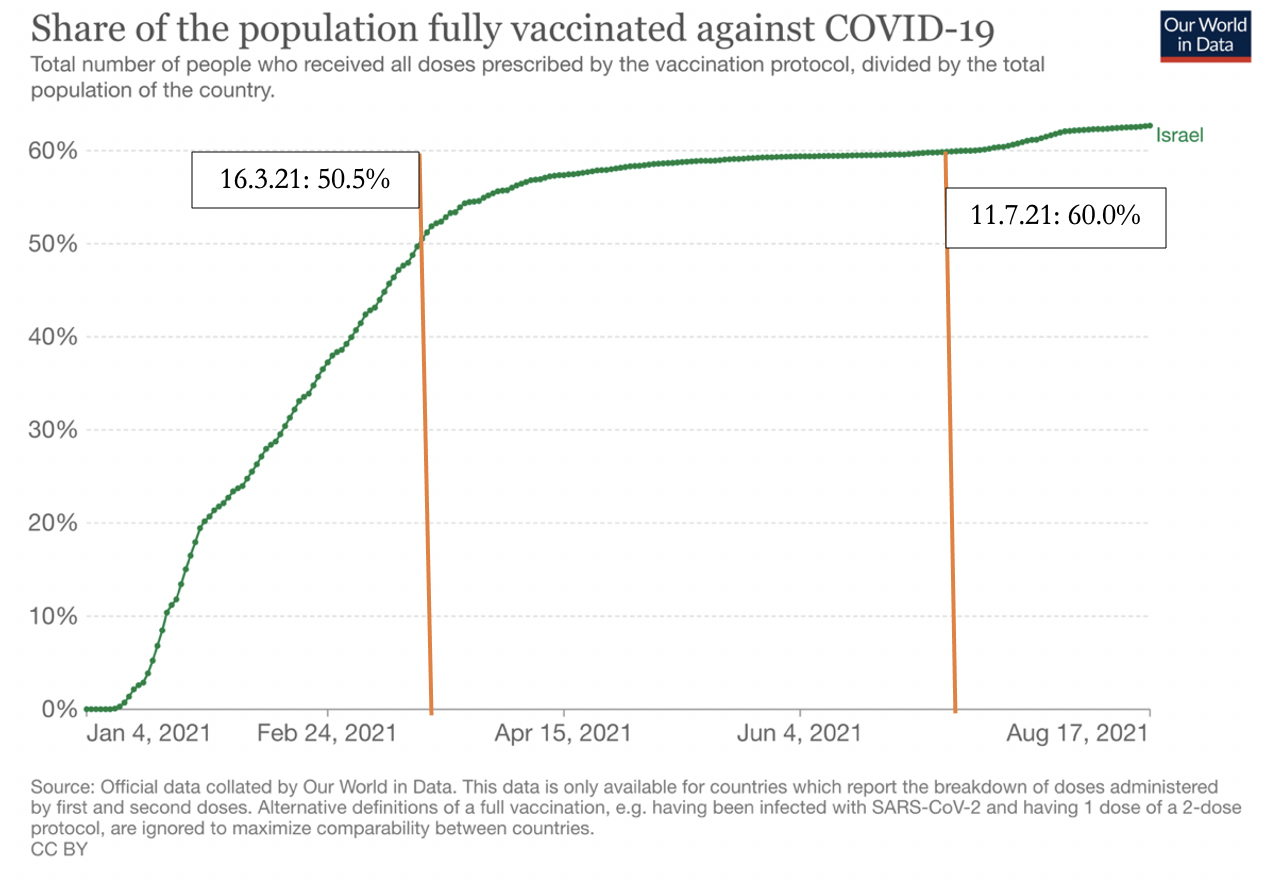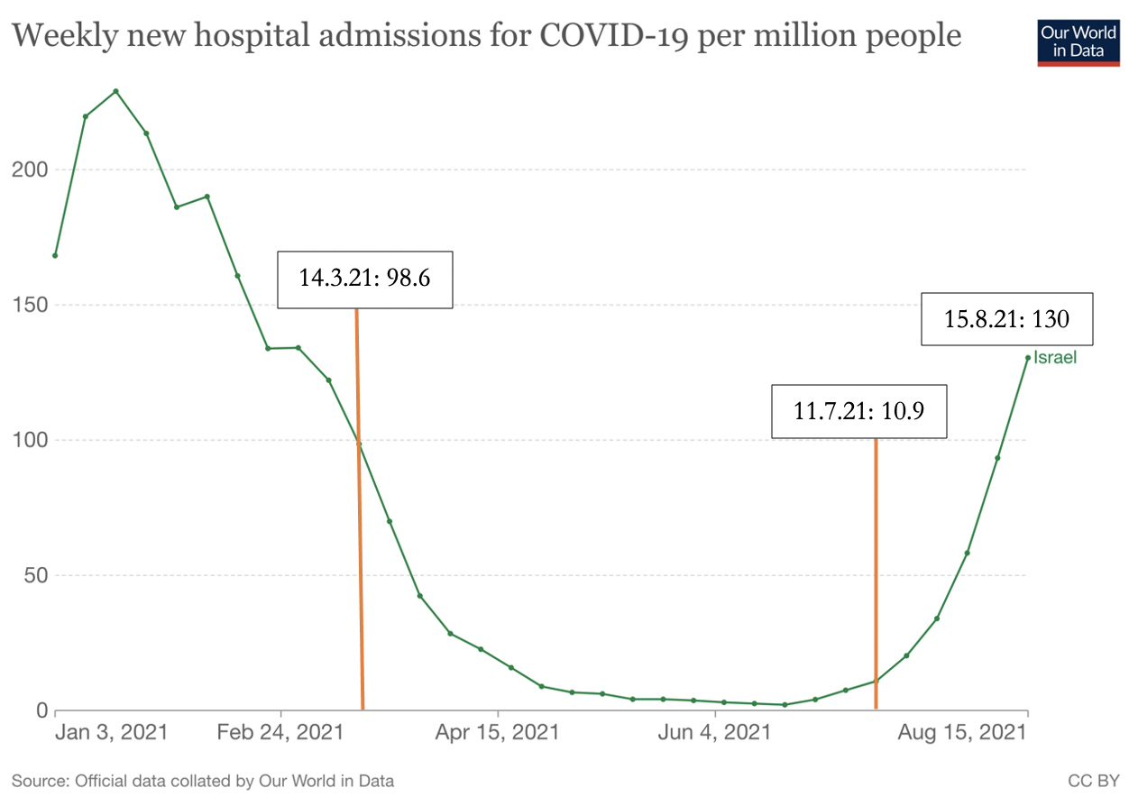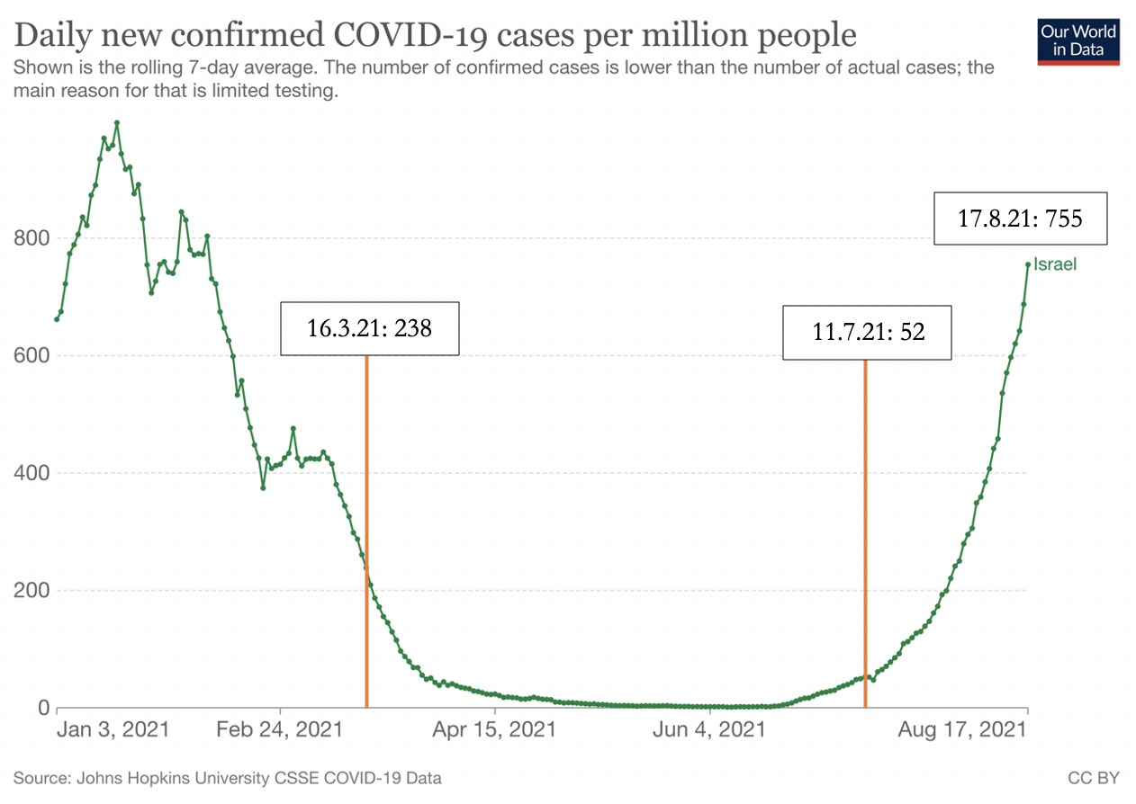 Iceland and Israel are two of the most heavily vaccinated countries in the world. Recently, 30 of a group of vaccinated Israelis who flew to Iceland contracted coronavirus. Half of Israel’s population was fully vaccinated on 16 March and, as of 17 August, 62.7 per cent of people – around 80 per cent of adults – were fully vaccinated (Figure 1). On 12 August, The Times of Israel reported, Israeli health officials warned that hospitals must prepare for an influx of nearly 5,000 coronavirus patients within weeks, half of whom will need acute care to deal with severe bouts of Covid-19. On the 18th, Coronavirus Commissioner Professor Salman Zarka said: ‘Morbidity is rising daily; I believe we are at war’. He foreshadowed the possibility of another round of tough lockdown during the High Holidays in September.
