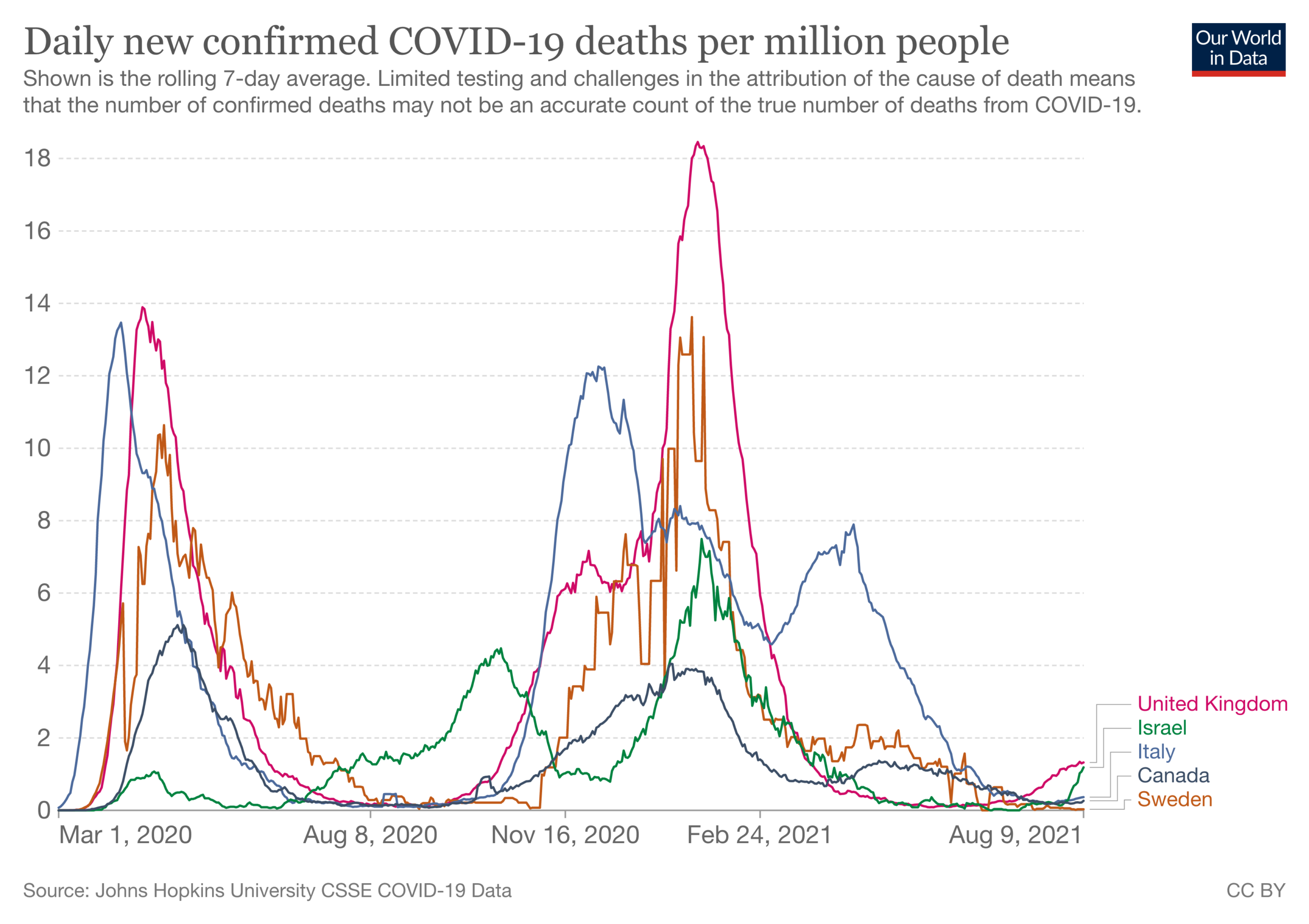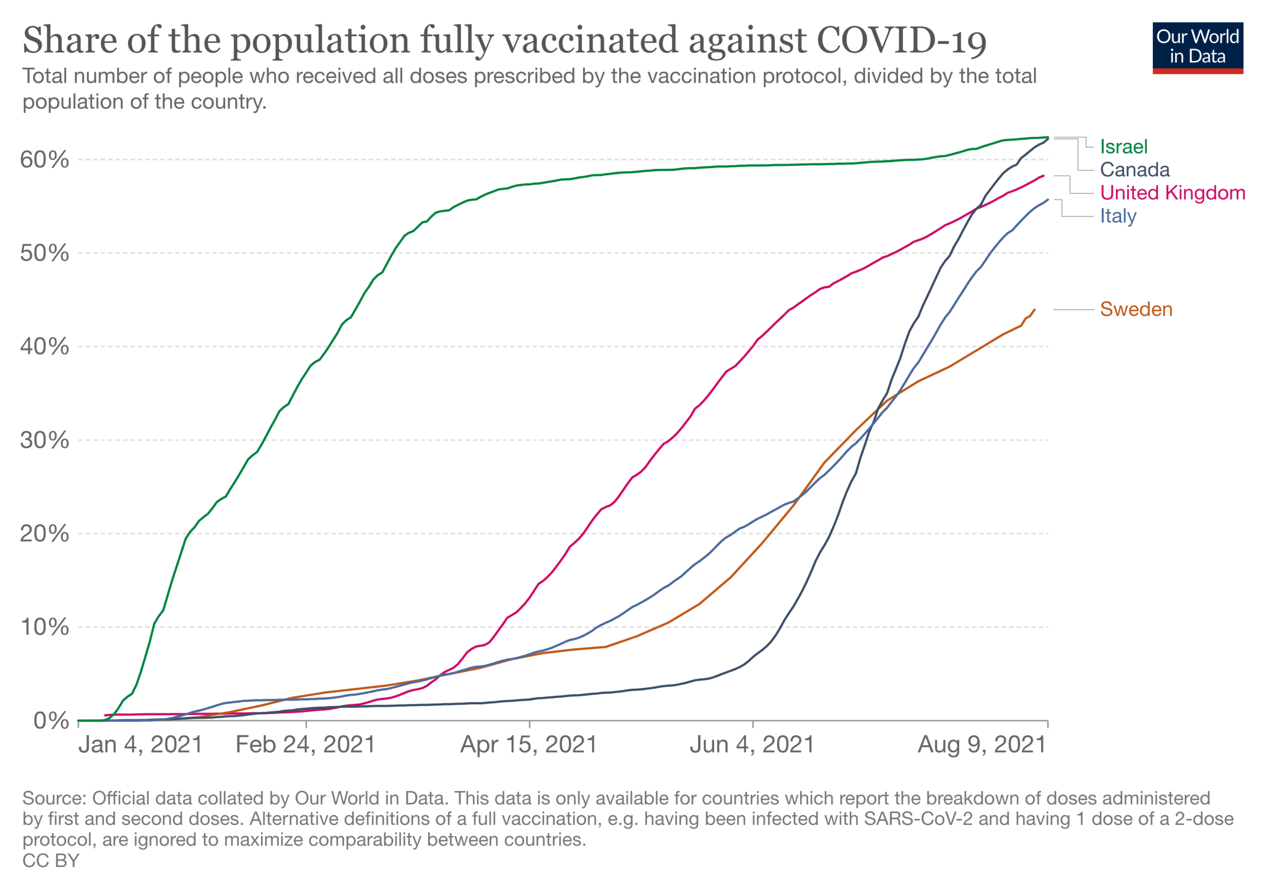 On 9 August, the spread of fully vaccinated was from 55.7% (Italy), 58.3% (UK), Canada (62.2%) to 62.4% (Israel). The Covid-19 daily new infections and deaths per million people for these countries on that date was: Canada (40/0.27), UK (407/1.32), Israel (442/1.19), Italy (99/0.36) (Figures 1-3).)