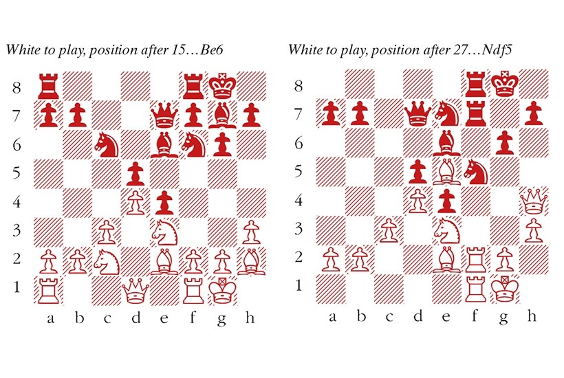 The position shown in the first diagram is calm and quite amenable to planning, so I suspect that Caruana’s ideas might have stretched five or six moves ahead. He probably started by envisaging a key idea for his opponent — to move the Nf6 and make way for f7-f5-f4, with a menacing pawn front. The exchange of pawns with 17 f3 and 18 fxe4 anticipates that, but it’s useful to wait until Black must recapture on e4 with the f5 pawn. There’s no reason to fear the passed pawn on e4, which is firmly blockaded. So Caruana’s 16 Qe1 was a clever waiting move, but one which prepared to gain influence on the kingside with 19 Bf4 and 20 Qg3. He may well have pictured his setup after 22 Raf1, though he could not guess exactly how Shankland would respond. At that point, Black’s position was already uncomfortable, but perhaps not beyond repair. Later on, Caruana’s 28 Ng4! heralded a splendid attacking finish.