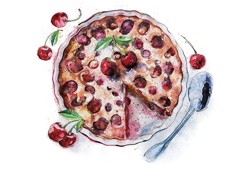 The clafoutis originated in Limousin, central France. Its name comes from the Occitan word ‘clafir’ meaning ‘to fill’, thought to refer to the way in which the batter is filled with fruit as it cooks and inflates. Really, it’s a flan: cherries are placed in a single layer, and then a thin batter — somewhere between waffle batter and custard — is poured over the top, before the whole thing is baked until the custard is golden and puffed, the cherries squidgy and fragrant.