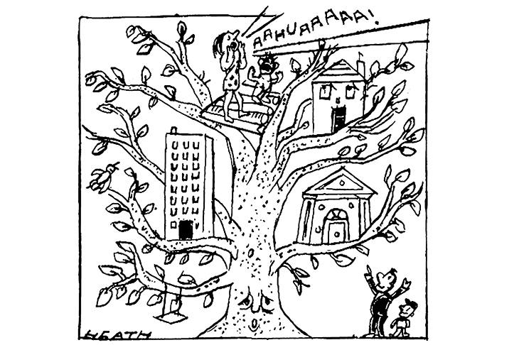 I think what I am saying is that treehouses have a special place in our unconscious. I was always envious of children who had one when I was growing up — my parents’ largest tree was a silver birch, which could only just cope with a birdhouse — but I could never say why. Nor why, on my first look round the house my wife and I eventually bought, the first thing I noticed was the mature tree in the garden with its capability for improvements; nor why, when it was finally erected, every child who visits excitedly runs to investigate.
