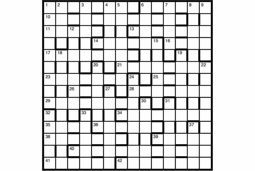 A first prize of £30 for the first correct solution opened on 1 November. There are two runners-up prizes of £20. Please scan or photograph entries and email them (including the crossword number in the subject field) to crosswords@spectator.co.uk – the dictionary prize is not available. We will accept postal entries again at some point.