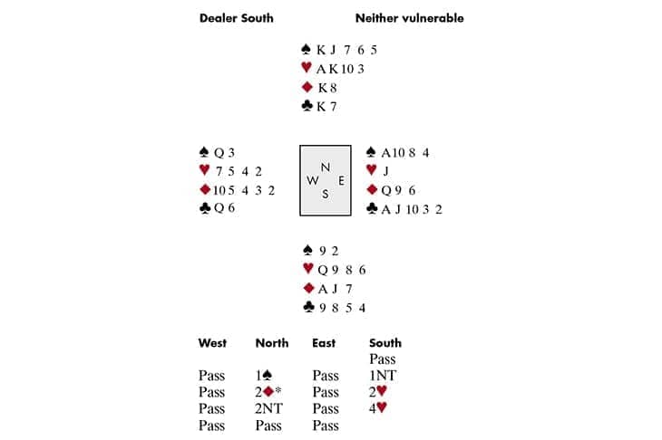 * transfer to hearts. West (Mike Bell) led the ♣Q, and East (Ben Norton) captured dummy’s ♣K with his ♣A. He cashed the ♣J, then switched to the ♦9. Tom rose with his ♦A and led a spade to dummy’s ♠J and East’s ♠A. East now played the ♣10. West discarded the ♠Q and Tom ruffed in dummy. This was unfortunate: if West was out of spades, Tom couldn’t ruff any. After some thought, he cashed the ♥AK and the ♦K, overtook the ♥10 with the ♥Q and cashed the ♥9, pitching a spade. East was down to ♠108 ♦Q. Finally, Tom cashed his ♣9 and East was squeezed: if he discarded a spade, dummy’s ♠K7 would be good, so he pitched the ♦Q — and Tom’s ♦J became the tenth trick. Bravo.
