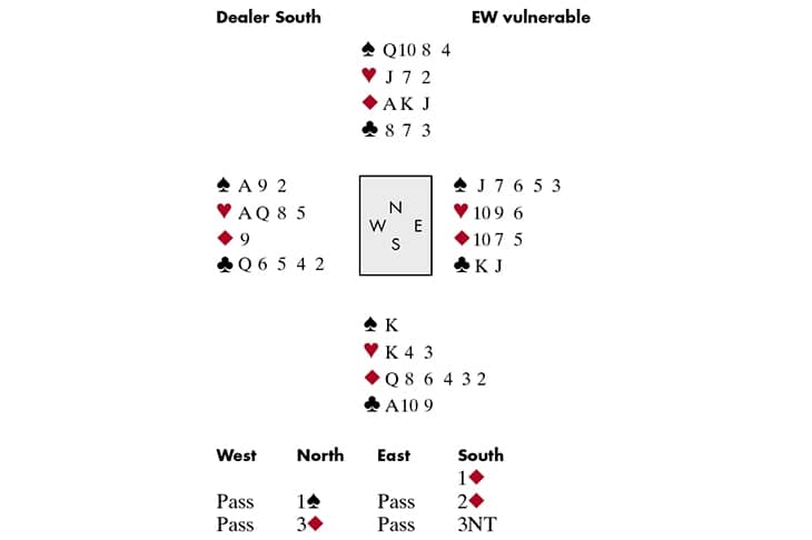 At the other table, West made a T/O of 1◆, and North/South stopped in 3◆, going one down.
