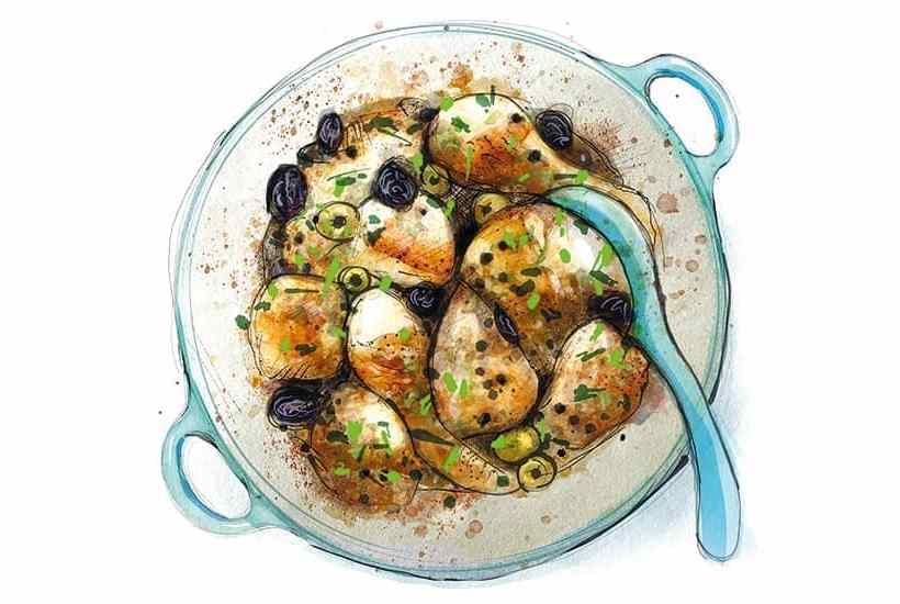 Like all good dinner party dishes, chicken Marbella can be prepared in advance and bunged in the oven while you attend to the devilled eggs. It is, in essence, a tray bake. The chicken is marinated overnight before being tipped into a pan with white wine and a sprinkling of sugar, then baked for under an hour. It is also a good weeknight supper.