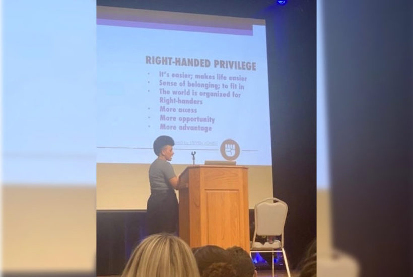 You’ve heard of white privilege and male privilege: meet right-handed privilege. A picture from the meme account Old Row went viral this week, showing a woman giving a presentation to a class with a slide entitled “RIGHT-HANDED PRIVILEGE.”