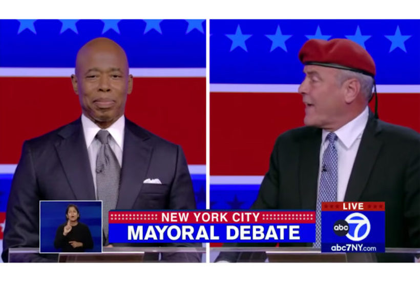 A viral video of Sliwa consoling a mentally ill homeless man outside Port Authority over summer may have been the most powerful moment seen in a generation in local politics. It was the sort of clip that could win an election, if New Yorkers were a little more open-minded when it came to Ds and Rs. During the debate, Adams, attempting to appear compassionate, referred to New York’s glut of drug-addled zombies, the homeless, as “our neighbors,” as though leaving a dump on your doorstep is the same as borrowing a cup of sugar.
