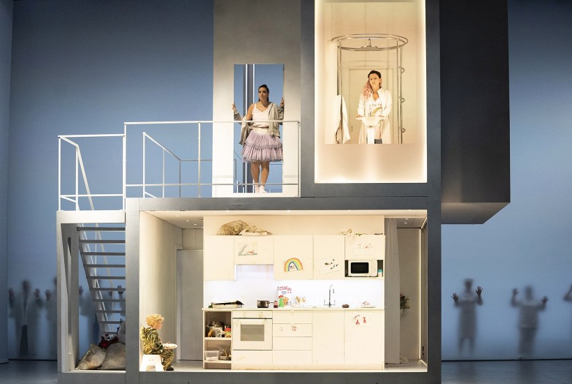 So Hume does that opera director thing of teleporting the action into an imaginary world that resembles nothing on Earth. Pinkerton’s love nest is a hard-edged minimalist living pod straight out of Monocle magazine. Staff in white overalls pad silently about, removing the dirty laundry; the men are totalitarian spa attendants and the women are mini-skirted retro-dollybirds (hence the pink beehives). The coolly choreographed rituals of Act One look as bizarre as you’d expect, though sudden, fantastical video effects (by Ash J. Woodward) soften the edges a bit. Then, in Act Two, realism jolts in. Cio-Cio San (Joyce El-Khoury) is now a delusional but devoted single mum, Suzuki (Anna Harvey) is frazzled, and little Sorrow crayons all over the pristine white walls.