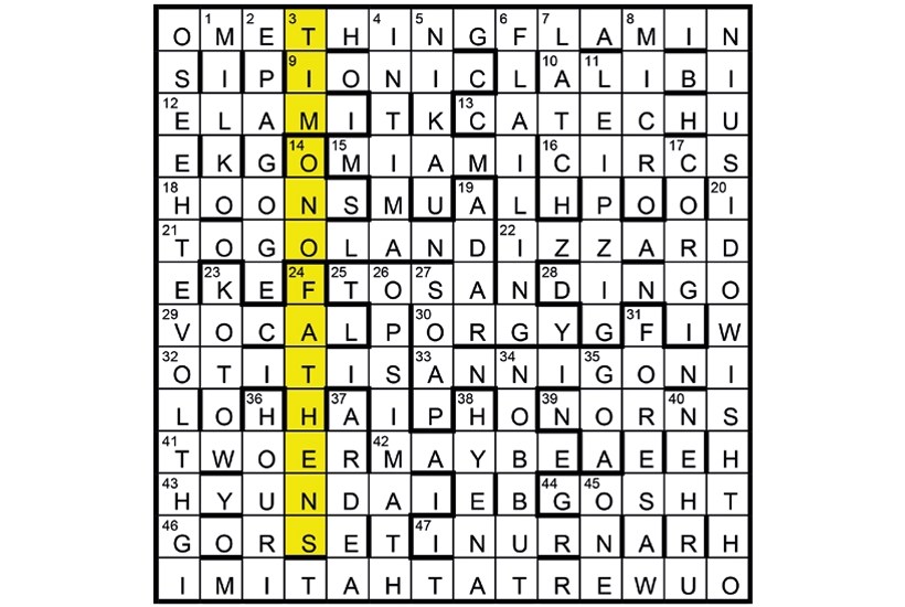 The quotation is ‘I DO WISH THOU WERT A [dog] THAT I MIGHT LOVE THEE SOMETHING’. The honest servant is FLAMINIUS. Unclued lights are dogs: TOSA (25), DINGO (28), CORGI (17) and HYENA (38). The source is TIMON OF ATHENS (in the fourth column) which was to be shaded.