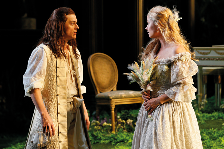 Christie Whelan Browne is a superb Rosalind and she is far and away the best thing about Simon Phillips’ consistently grand and overtly gorgeous production. This As You Like It, designed and with costumes by Alicia Clements, has an almost parodic lushness of clobber and plumage. The courtiers at the bad duke’s court in what looks like slightly later –perhaps Caroline – brocade with black plumes in their bonnets and much grandeur of silk and satin and splendour – are slightly over the top walking shadows of the unnatural though they are cousins to some of the worldlings in both Phillips’ Twelfth Night and his equally chocolate box Shakespeare in Love.