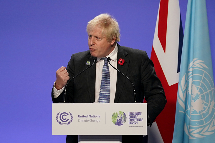 Given that Johnson had just gone full apocalyptic prophet – ‘it’s one minute to midnight on that doomsday clock and we need to act now’ – his jetting to the dinner inevitably led to charges of hypocrisy, notwithstanding his minders’ pathetic attempts to claim that his plane’s fuel was ‘sustainable’. For his return journey to Glasgow, he took the train.