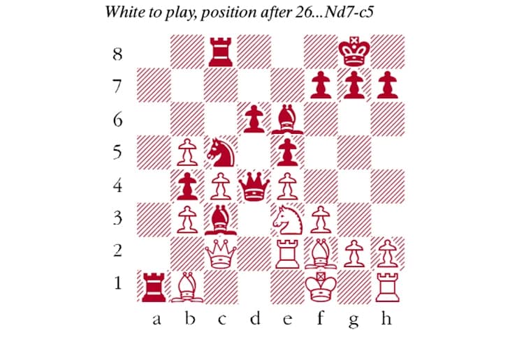 27 g4 27 Nd1 Nxb3! 28 Bxd4 Nxd4 leaves Black on top. Nxb3 28 Kg2 Nc5 29 Nd5 Qxc4 30 Ne7+ Kf8 31 Nxc8 Bxc8 32 Ba2 Qxb5 33 Rxa1 Bxa1 34 Bc4 Qb6 35 Bxc5 dxc5 36 Qa2 Bd4 37 Qa8 Qb7 38 Ra2 Ke8 39 Bxf7+ Kxf7 40 Ra7 Qd7 41 Qd5+ Ke7 42 Rxd7+ Bxd7 The passed pawns and bishops are strong, but Black’s king is never safe from harassment. 43 Qg8 Kd6 44 g5 Be6 45 Qxg7 b3 46 Qxh7 b2 47 Qb7 Bf7 48 f4 exf4 49 Kf3 Bc4 The decisive error. Better was 49…c4! 50 g6! Be6 which remains unclear. But not 50…Bxg6? 51 e5+!, e.g. 51…Kxe5 52 Qe7+ Kd5 53 Qg5+ and wins. 50 g6 Bd3 51 g7 Bc4 51…Bxg7 52 Qd5+ wins. 52 Qb6+ Kd7 53 Kxf4 Bxg7 54 e5 Bh6+ 55 Kg3 Bc1 56 Qd6+ Kc8 57 Qxc5+ Kb7 58 Qb4+ Ka7 59 h4 Be6 60 h5 Ka6 61 h6 Bf5 62 h7 Now 62…Bxh7 63 Qd6+ and White forks the Bh7 with check next move. Black resigns
