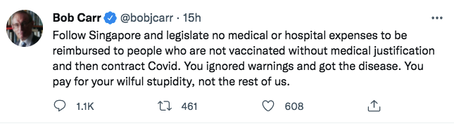 According to the Labor Party statesman, if you are unvaccinated and get sick then you are stupid and the rest of us aren’t here to help you.