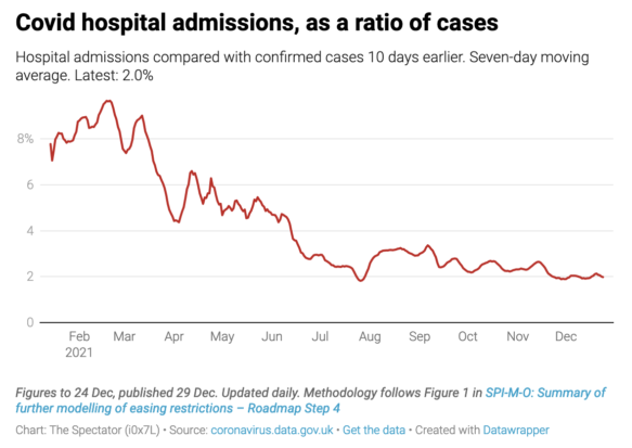There is no doubt that UK hospital figures are surging – but due to Covid-positive hospital patients being treated for something else, the real picture will take a while to settle. The chart we at The Spectator have so far been using to track the case/hospitalisation ratio is below: it uses Sage methodology and, three weeks on from Omicron, it has not (so far) recorded a drop.