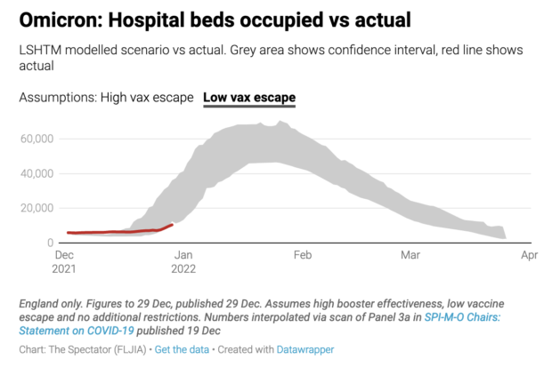 One final point on hospital occupancy. The Spectator data hub will soon be starting to measure the latest Sage ‘scenarios’ against actual, as we have done for previous waves. Our first such chart is below: from the London School of Hygiene and Tropical Medicine (LSHTM) published 19 Dec showing a high vax-escape and low vax-escape scenario.