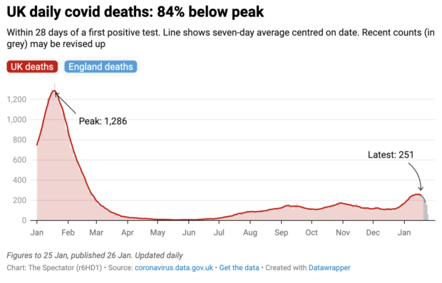 There are many factors behind Covid deaths, of course, and socioeconomic conditions are different in each of the four UK nations (although thanks to its larger conurbations you might have thought England was most vulnerable). But the figures certainly don’t suggest that Wales, Scotland and Northern Ireland have gained anything through implementing tighter rules on face masks, social gatherings, vaccine passports, working from home etc. — indeed, in terms of death rate, they have come off worse. By implication, it is doubtful whether Plan B has had any beneficial effect on fighting Covid in England, either.