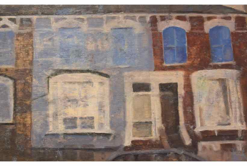 The series the ads inspired, ‘A Place to Live’, now runs to more than 60 images of London housing, from Victorian terraces to tower blocks, painted in thinned oil paint on unprimed plywood to replicate the graininess of newsprint. A selection hangs in the exhibition alongside works by four contemporary painters who share Burgess’s obsession with where we live. Each of them operates on a different turf. Jonathan Hooper has spent the past ten years painting the suburban semis surrounding him in Leeds, giving the nabis treatment to their mock-Tudor gables and Edwardian bay windows, dousing their neat façades in painterly colour. Narbi Price has been drawn to Ashington in Northumberland, former home of the Pitmen Painters, where since 2015 he has recorded in melancholy detail the decaying fabric — the obsolete phone box, the empty window — of what was once Britain’s biggest mining village.