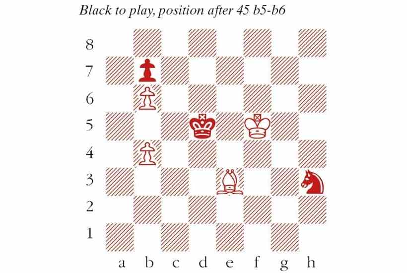 Giri has just played 45 b6. Shankland resigned because his knight is trapped, and can be collected soon; 45…Kc4 46 Kg4 Kd3 47 Bc5 offers no respite. But all he had to do was write it off: 45…Kd6, followed by a retreat to c8 achieves an unassailable fortress, quite often found in textbooks. If the Black king reaches a8, any encroachment from the White king produces a stalemate. White may place the bishop on f4 before Kc8-b8 is played, but then Black just plays Kc8-d7 (or d8). In that situation, bringing up the White king still results in a stalemate. Giri, wise to this, made sure to confirm that Shankland’s outstretched hand really was a resignation, rather than a tacit draw offer!