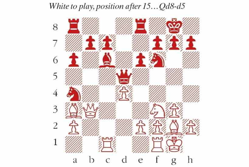 1 d4 Nf6 2 c4 e6 3 Nf3 d5 4 g3 Be7 5 Bg2 O-O 6 O-O dxc4 7 Na3 Bxa3 8 bxa3 Bd7 9 a4 Bc6 10 Ba3 Re8 11 Qc2 Nbd7 12 Rac1 a6 13 Qxc4 Nb6 14 Qc3 Nxa4 15 Qb3 Qd5 (see diagram) 16 Rxc6 Qxc6 17 Ne5 Qb5 18 Qc2 Black’s problem is that the queen on b5 is awkwardly bound to the knight on a4. Nd5 The best defence was extremely hard to spot: After 18…Nb6 19 Bxb7 Nc4! Black survives. But even there, after 20 Bxa8 Nxa3 21 Qc6! the wayward knight on a3 means Black isn’t out of danger. 19 Rb1 Qa5 20 Bxd5 exd5 Now Black is lost. The lesser evil was to write off the knight on a4: 20…Qxd5 21 Qxa4 f6 22 Nd3 Qxa2. The bishop and knight have lots of loose pawns to aim at, so they slightly outweigh the rook and two pawns, but there is all to play for. 21 Rxb7 The chief threat is to trap the queen with Ba3-b4, and 21…Nb6 22 Qxc7 only makes things worse. c5 22 Qf5 Rf8 23 Nxf7 Qd8 23…Qe1+ 24 Kg2 Qxe2 25 Qxd5 sets up a smothered mate threat to which there is no good answer: 26 Nh6+ Kh8 27 Qg8+ Rxg8 28 Nf7 mate. 24 dxc5 Qf6 25 Qxf6 gxf6 The endgame brings Black only temporary relief. 26 Nh6+ Kh8 27 c6 Rfc8 28 c7 Nc3 29 Bb2 d4 30 Nf7+ Kg7 31 Nd6 Kg6 32 Kf1 Nb5 33 Nxc8 Rxc8 34 a4 Nxc7 35 Bxd4 Ne6 36 Be3 Black resigns