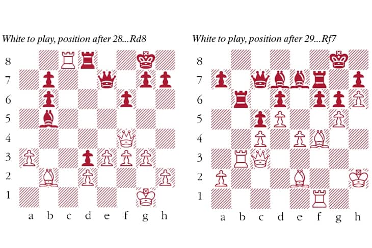 30 Bc1! Qd8 31 Bb2 Qf8 32 Kg2 Calmly does it. Any capture on g5 spells disaster with Qh8 mate. Bd8 33 Qf3 Instead 33 gxf6 Qxh6 would be too hasty. Nakamura doesn’t fear the capture on g5, as the queen can always return to c3. Bc8 34 Qe3 Rxb3 35 axb3 fxg5 A desperate attempt at escape, but waiting doesn’t look better. For example, 35…a5 36 Ba1 Bd7 37 Kg3 Bc8 38 gxf6 Bxf6 39 Rxf6! Rxf6 40 Qc3 is crushing. 36 Qc3 Rxf1 37 Qh8+ Kf7 38 Qxh7+ Ke8 39 Qxg6+ Not 39 Bxf1 Bh3+ and Black wins. Ke7 40 Qxg5+ Rf6 Instead 40…Kd7 41 Qg7+ Rf7 42 Qxf8 Rxf8 43 Bg4+ Kc7 44 Bxc8 Kxc8 45 h7, would be a straightforward technical win for Nakamura. 41 h7 Kd7 42 Qg8 42…Rf2+ 43 Kg1 brings no relief so White will soon have an extra queen. Black resigns.