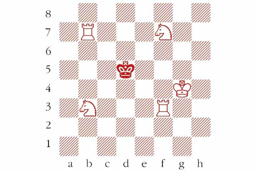 White to play and mate in two moves. Composed by Touw Hian Bwee, Schakend Nederland 1976. The first move allows Black’s king to run in any of four directions, with a different mating response to each one. What is it? Email answers to chess@spectator.co.ukby Monday 14 February. There is a prize of £20 for the first correct answer out of a hat. Please include a postal address.
