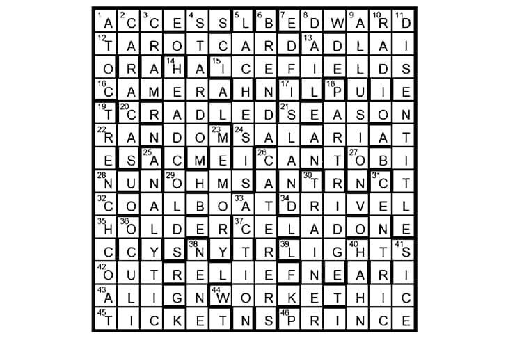 The unclued lights form a quartet of three-word terms, each of which has the letter count of (6,6,6) which is the ‘number of the Beast’: 21/45/35, 22/1A/23, 39/16/33 and 46/7/17.