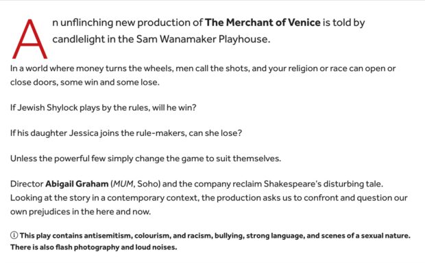 Hosted by the Sam Wanamaker Playhouse at the Globe, the show has taken every effort not to offend any sensibilities by including a warning on its website for all potential ticket-buyers. It tells culture vultures, seeking to get their Shakespeare fix, that along with the traditional note of a performance containing ‘flash photograph’ the play also contains ‘anti-Semitism, colourism, and racism, bullying.’ How achingly right-on. Mr S wonders if such guidance will become a staple for other productions too in due course, now that Shakespeare’s most infamous stereotype has been singled out by his spiritual successors.
