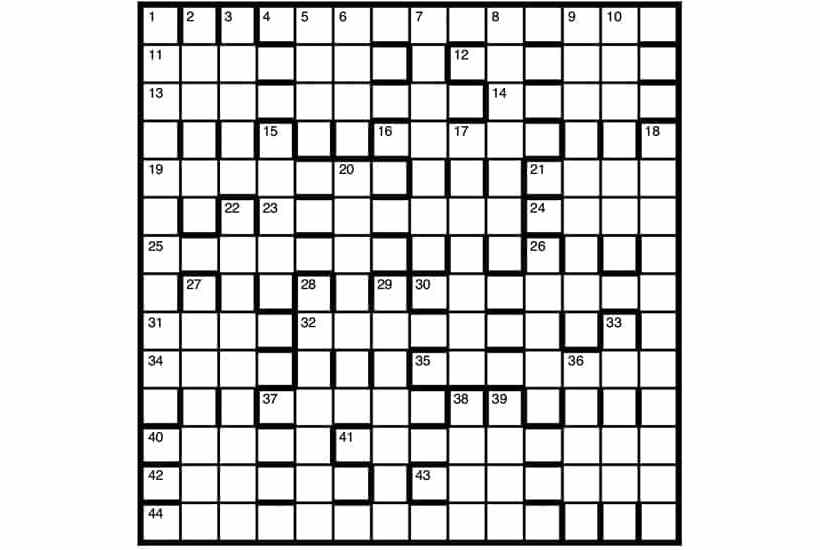A first prize of £30 for the first correct solution opened on 4 April. There are two runners-up prizes of £20. Please scan or photograph entries and email them (including the crossword number in the subject field) to crosswords@spectator.co.uk – the dictionary prize is not available. We will accept postal entries again at some point.