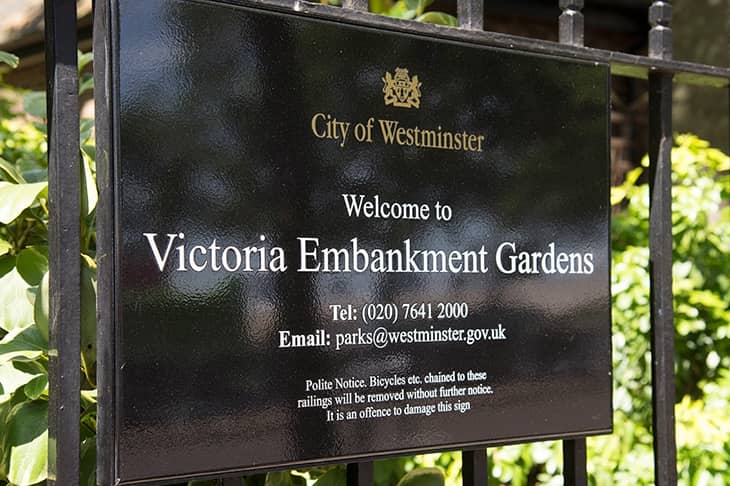 Once, as evidenced by the 1626 York Watergate on the northern side of the lawns, this verdant park was the river Thames; but when Sir Joseph Bazalgette put in a main sewer along what had been the water’s edge, it was decided to push the Thames back and reclaim the land for a highway and gardens above the sewer. Nearly 150 years ago the public park was born.