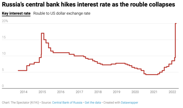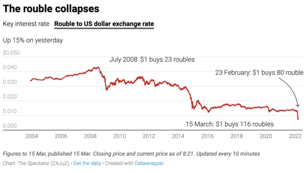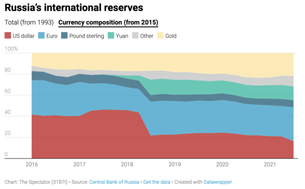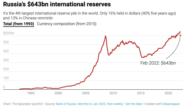 For a start, Russia doesn’t actually have much debt of any type, thanks to years of huge energy surpluses. Prior to the invasion of Ukraine, annual government borrowing and the stock of debt were both relatively low (gross government debt was less than 20 per cent of national income).