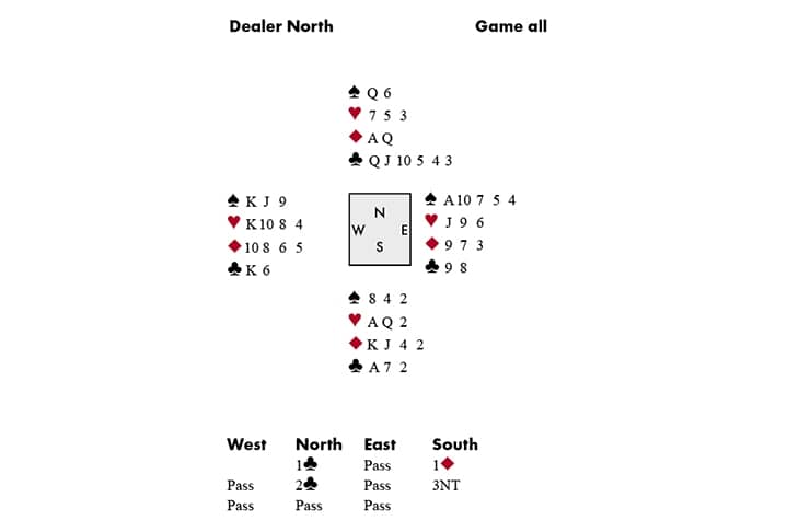 West led the ♥4 to East’s ♥J, and Gunnar played… the ♥A! He knew that if he won with the ♥Q and took a losing club finesse, West would have no problem switching to a spade; creating the illusion that the ♥Q was with East was his only hope. Sure enough, Gunnar crossed to the ◆A, and ran the ♣Q – and West won and played the ♥8 to Gunnar’s ♥Q. Not the most thoughtful defence – but if you haven’t seen that old trick before, why wouldn’t you?