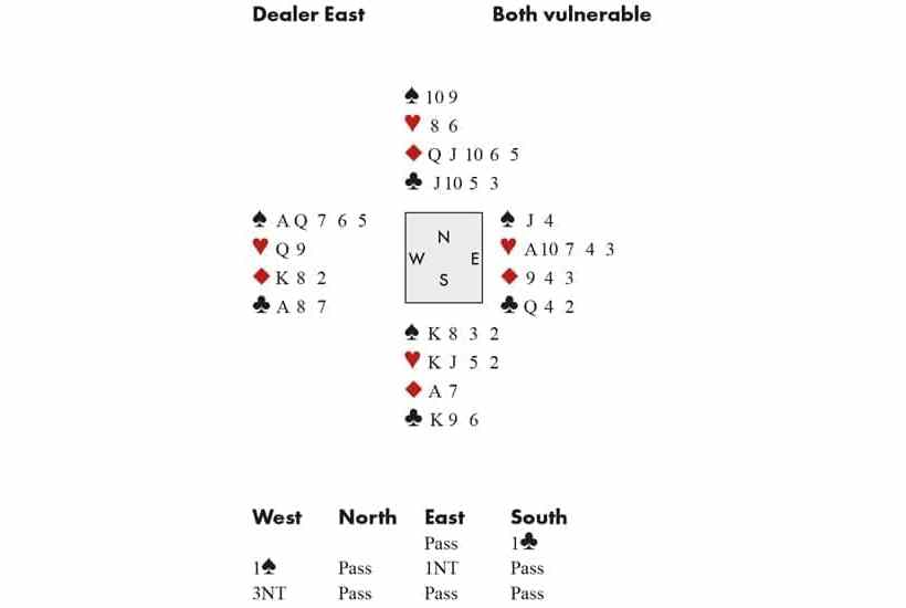 Byrne (East) made a minimal 1NT response, and ended up rather too high in 3NT. South led the ♥2, and dummy’s ♥Q won. A spade to the ♠J lost to the ♠K, and when South continued with the ♥K, Byrne played the ♥10 underneath! The false-card was aimed at attracting a heart continuation, and the ♥J duly came next. Byrne won with the ace, and cashed two more hearts. Next came a diamond. South played low and dummy’s ◆K won, North signalling with the queen. Next came a dazzling piece of card-play: the ace, queen and a low spade endplayed South. He cashed the ◆A but then had to lead from his ♣K96 into the split tenace.