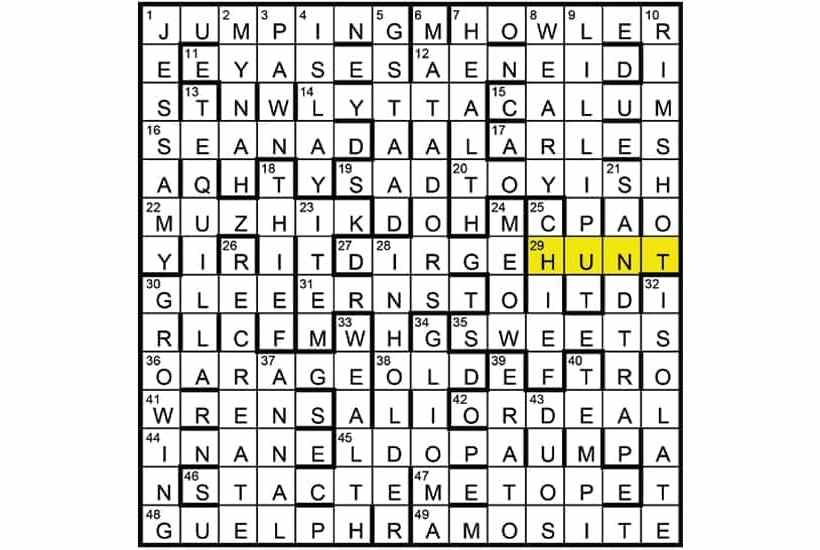 The poem is ‘Rondeau’ by Leigh Hunt. Its first three words as quoted in ODQ are ‘JENNY KISSED ME’ (diagonally from 1). The words are JUMPING (1A), SAD (19), SWEETS (35), OLD (38), HEALTH (7D), WEARY (8), THIEF (18), GROWING (30D) and WEALTH (33). HUNT (29) was to be shaded.