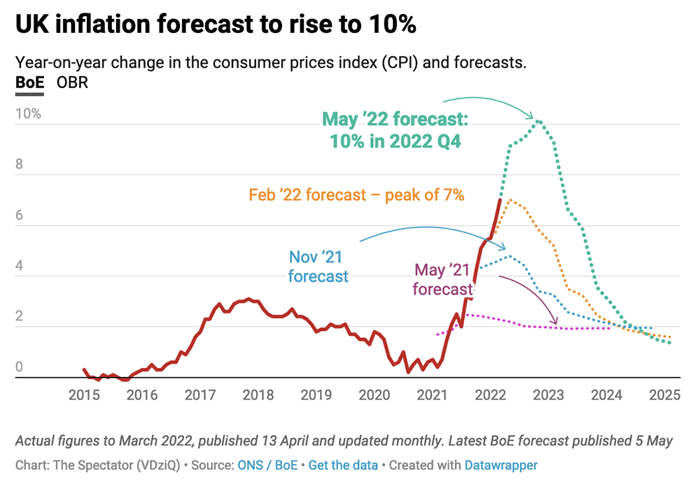 The line of reasoning used throughout the session by the governor was that the price hikes Britain is experiencing are largely unavoidable. ‘80 per cent’ of these rises are due to international phenomena that are out of domestic control, we were told; these can’t be curbed by monetary action from the Bank, was the message. According to Bailey today, those factors were largely down to Russia’s war in Ukraine, which he believes largely explains why inflation in Britain is on track to hit double digits by the end of the year.
