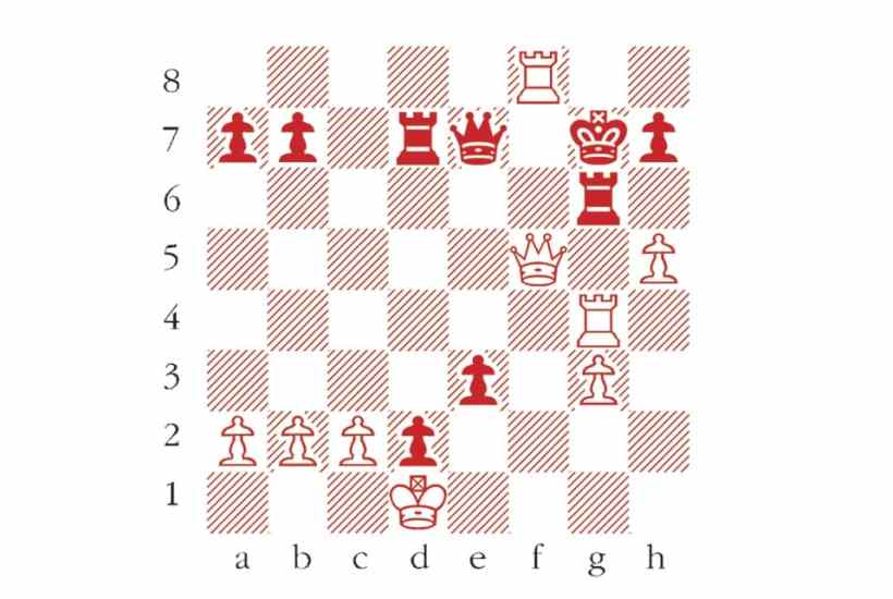 White to play. Averbakh-Zita, Szczawno-Zdroj 1950. Black has just interposed Rb6-g6, so White needs an accurate finish before e3-e2 mate arrives. What did Averbakh play next? Answers should be emailed to chess@spectator.co.ukby Monday 16 May. There is a prize of £20 for the first correct answer out of a hat. Please include a postal address and allow six weeks for prize delivery.