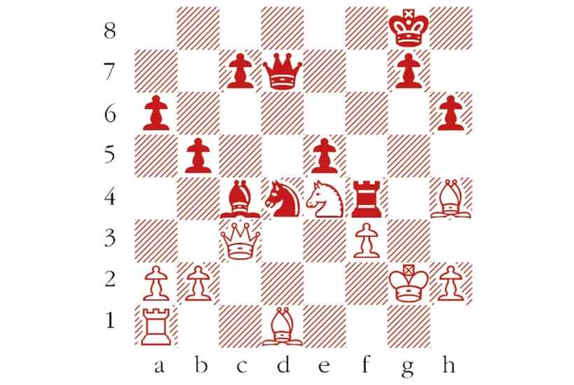 White to play. Vachier-Lagrave-Caruana, Bucharest 2022. The Bh4 can retreat to g3, f2 or e1. Which one is best, and why? Answers should be emailed to chess@spectator.co.ukby Monday 23 May. There is a prize of £20 for the first correct answer out of a hat. Please include a postal address and allow six weeks for prize delivery.