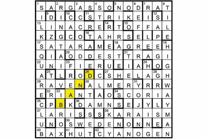 The four-letter word was BAND. Unclued lights suggest bandicoot (7A),bandh (11), banda (41), bandana (1D), bandoneon (3), bandook (7D), bandar (14),bandolero (19) and bandy (35). BAND (ending on 26) was to be shaded. Title:name of a BAND.