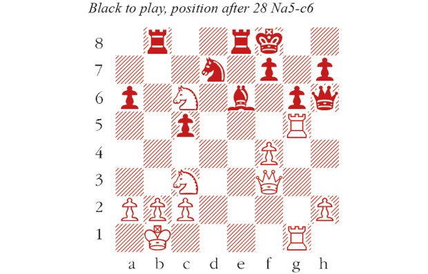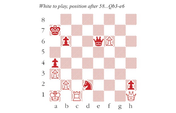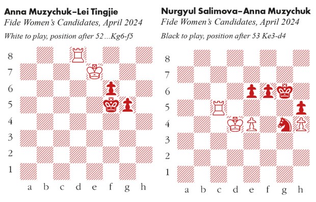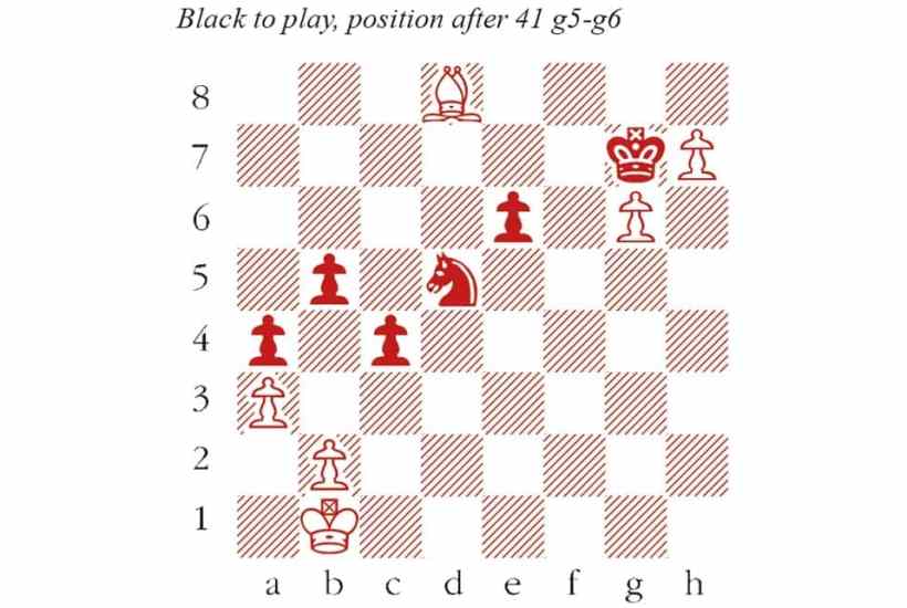 1 d4 Nf6 2 c4 e6 3 Nc3 Bb4 4 Qc2 O-O 5 a3 Bxc3+ 6 Qxc3 d5 7 Bg5 dxc4 8 Qxc4 b6 9 Rd1 Ba6 10 Qa4 h6 11 Bh4 Qe7 12 Nf3 Rd8 13 Qc2 c5 14 e4 Bxf1 15 Rxf1 g5 16 Nxg5 hxg5 17 Bxg5 Nc6 18 Qc1 18 e5 Nxd4 yields sufficient counterplay. Firouzja’s transfer of the queen to f4 creates deeper problems, and Nakamura spent more than 40 minutes considering his reply. Rxd4 18…e5 is a plausible alternative, but 19 d5 Nd4 20 Rd3 creates dangerous threats of Rd3-g3 and f2-f4. 19 Rxd4 Nxd4 20 Qf4 Nc2+ 21 Kd1 Qd7+ 22 Kxc2 Qa4+ 23 Kb1 Qxe4+ 24 Qxe4 Nxe4 Nakamura has avoided a calamity, but White’s kingside pawn majority is more mobile, and soon poses fresh problems. 25 Bf4 Nf6 26 h4 Nd5 27 Bd2 f5 28 g3 Kf7 29 f3 Rh8 30 Bg5 c4 31 g4 b5 32 Rd1 fxg4 33 fxg4 a5 34 h5 Rg8 35 Rf1+ Ke8 36 h6 The bishop is immune: 36…Rxg5 37 h7 wins Rf8 Very well judged – the pawns will advance even further, but Nakamura has seen that he can hold the line. 37 Rxf8+ Kxf8 38 Bd8 a4 39 g5 Kf7 40 h7 Kg7 41 g6 (see diagram) A critical position, with a strange standoff. The knight is tied to its outpost, on pain of Bf6+ followed by h8=Q. And yet it also dominates the bishop, which cannot reach e5 or d4 by a direct route. c3! 41…e5 looks safe at first sight, since a future Bd8-h4-g3 is met by Nd5-f4. But White wins with precise play, charting a route for the king via e1-f2-f3-e4 to dislodge the knight. This exchange of pawns brings Black a step closer to a passed a-pawn, which buys time later on. 42 bxc3 Firouzja thought for more than an hour, but there is nothing better. 42 Bh4 e5! 43 Bg3 Nf4 draws Nxc3+ 43 Kc2 Nd5 44 Bg5 e5 45 Kd2 45 Kd3 Nf4+ 46 Bxf4 even loses: 46…exf4 47 Ke4 b4 and White’s king is overstretched. Kh8 46 Ke1 b4 47 axb4 a3 48 Bc1 Nxb4 49 Kd2 Nd5 50 Bxa3 Nf4 51 Bb2 Nxg6 52 Bxe5+ Nxe5 53 Kc3 Kxh7 54 Kd4 Draw agreed