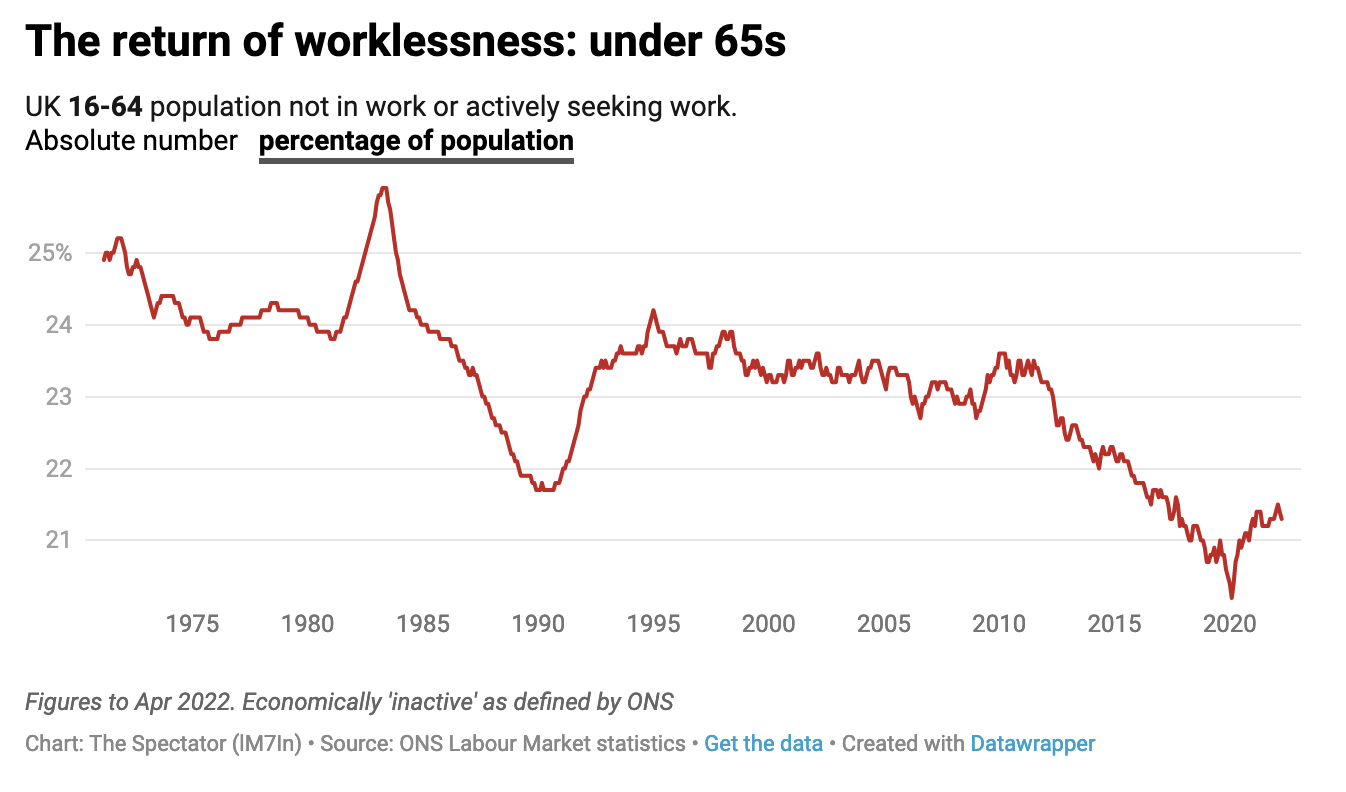 In the short-term, Britain’s workforce seems stable. While prices spiral and growth remains largely stagnant, there are no immediate signs of rising unemployment. And the chunk of the population not working – the economically inactive – softened to 21.3pc, down 0.1 points. Still well above pandemic levels, but heading in the right direction.