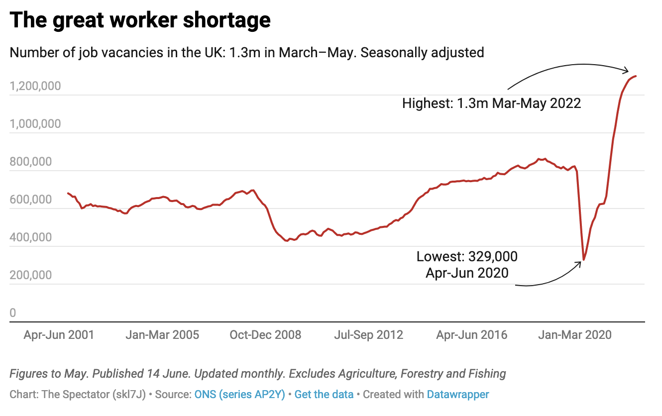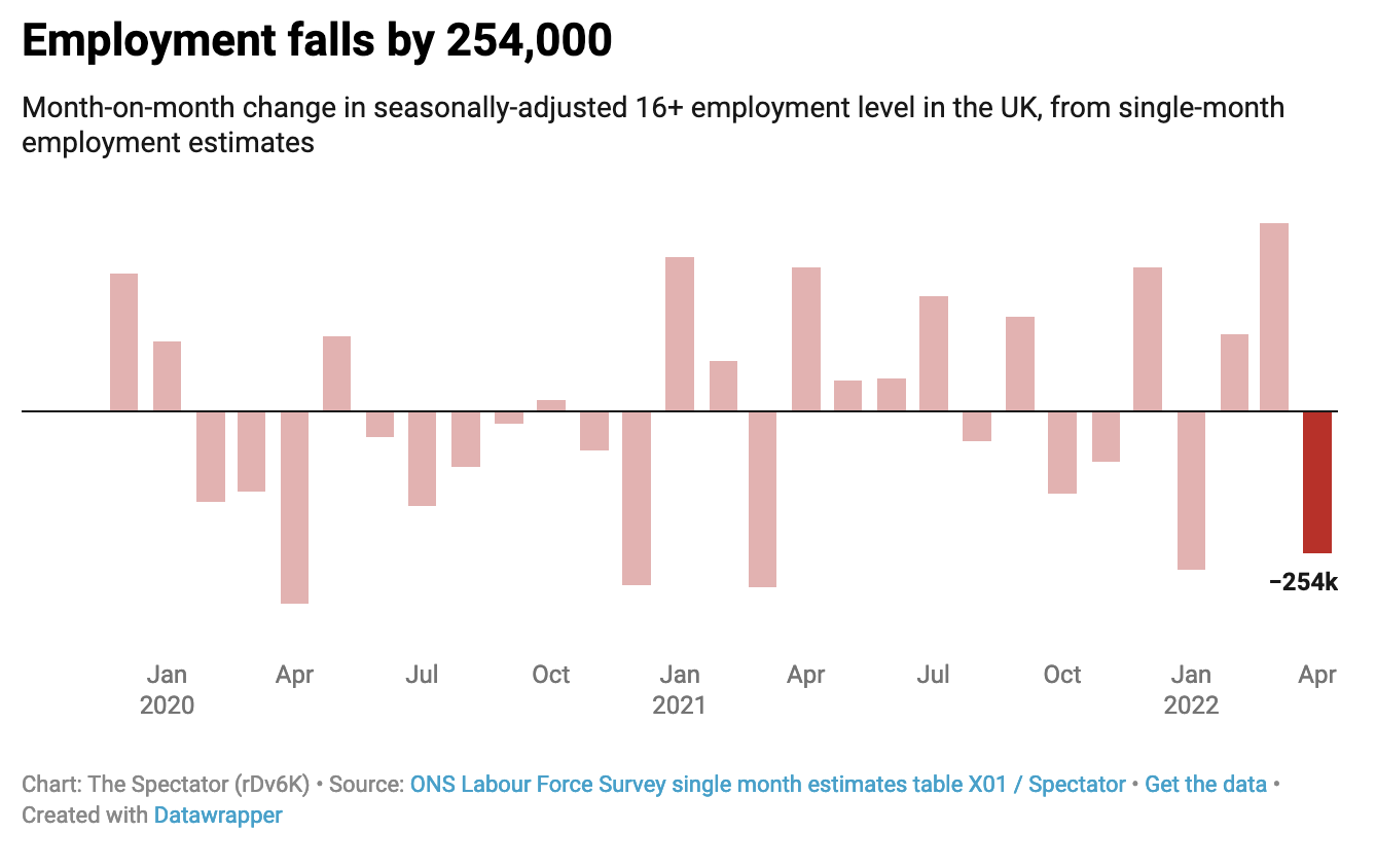 There’s a reason the headline numbers are calculated using data from multiple months: what happened in April alone is less informative than the trend building up for some time. But with inflation at 9 per cent on the year in April, and expected to rise further, it’s expected that knock-on effects will hit the labour market as some point. It’s already having an effect on pay, as today’s figures show: while growth in regular pay was up 4.2 per cent in February to April, regular pay in real terms fell on the year by 2.2 per cent, meaning despite pay hikes, declined purchasing power has workers feeling worse off.