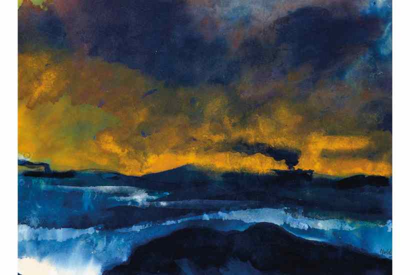 The iridescent palette of Nolde’s seascapes recalls ‘The Ancient Mariner’s ‘water like a witch’s oils’, and ‘painted witchcraft’ is how the Nazis described his work in the Degenerate Art exhibition of 1937. Coming from a farming community that fervently hoped Hitler would save them from financial ruin, Nolde had joined the Danish Nazi party in 1934 and never came to terms with the National Socialists’ rejection of his work. But we have the Nazis to thank for his extraordinary late watercolours, the fume-free medium to which he was forced to turn in 1941 after they banned him, aged 74, from making art at all.