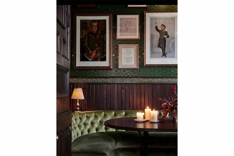 We, though, are downstairs at the George. We have come from Cornwall, and when the staff see our luggage they put us in the snug by the main bar. It is likewise beautiful: dark-green embossed wallpaper; pale-green velvet benches tight to the table, so I feel ecstatically trapped in the snug; an obituary of local creative drunks crawling up the wall in engravings and oil paintings, shinier in death than in life; a television switched off, because there is no cricket. My husband marvels at the carpet, which is a wild swirling pub carpet, but new. He has never seen a new pub carpet, he says. He wasn’t sure until now that they existed.