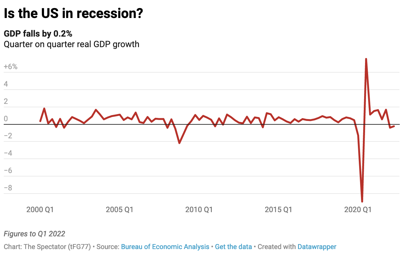 There’s an almighty debate ongoing in the US about what exactly a ‘recession’ is. Regardless of semantics, the numbers are bad. Figures released today show that the economy shrank by 0.2 per cent in the second quarter of this year, following a 1.6 per cent fall in the first quarter. Over the year, the US economy is now 0.9 per cent smaller than it was a year ago. Remarkably, the news comes just a day after the Federal Reserve raised interest rates by 0.75 per cent – the second such rise in as many months.