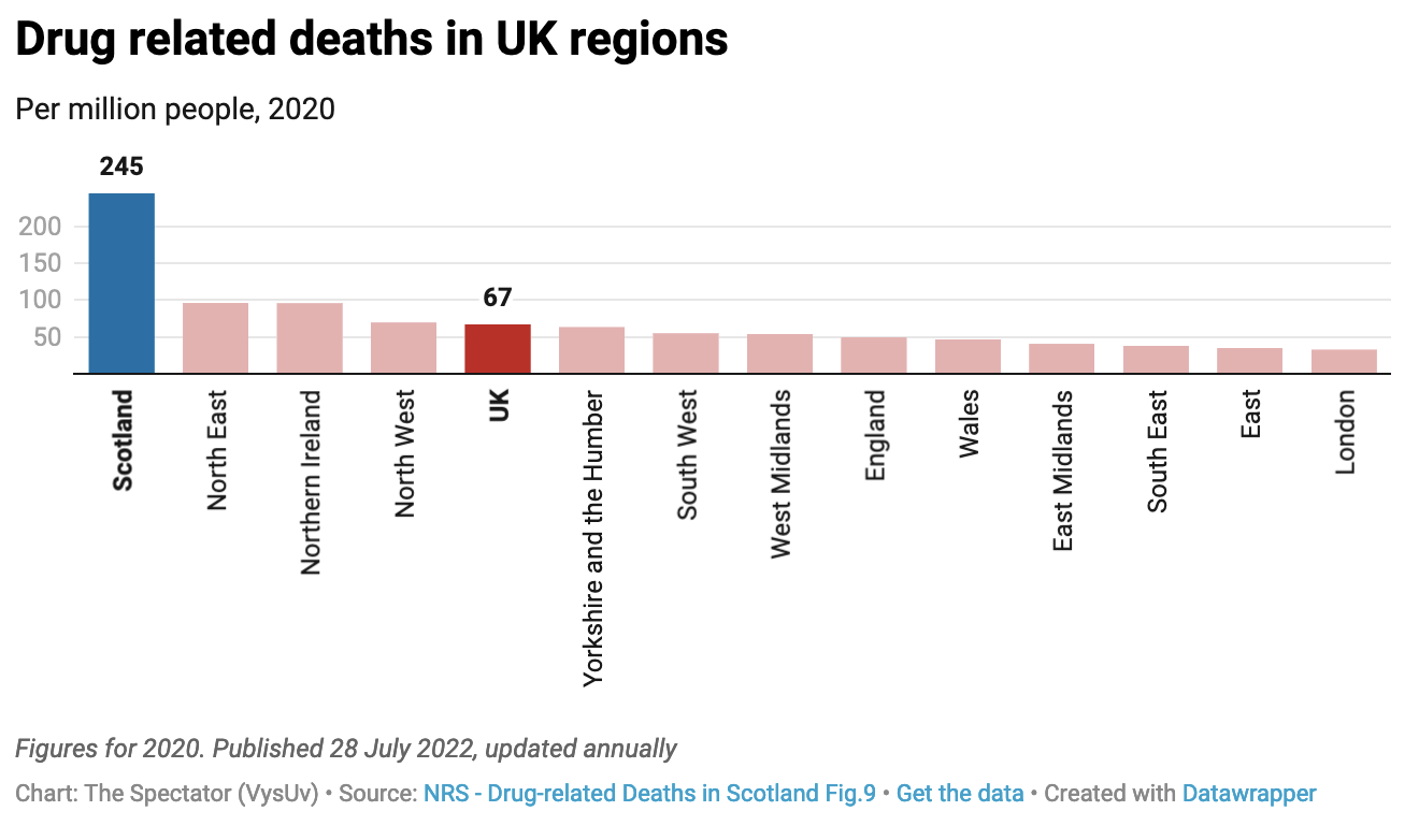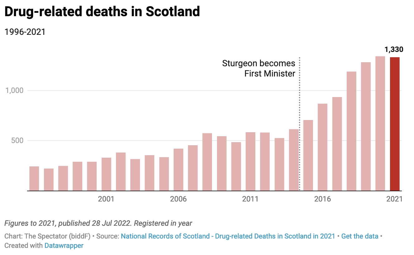 Sturgeon’s government says the situation is ‘unacceptable’ but this is no new trend. This year was the first year deaths haven’t increased since 2013. More people died from drugs in Scotland in 2021 than the number that died of Aids in Gambia, deaths were nearly twice as high as those killed on the US/Mexico border and in the whole of Britain there were just 60 more deaths from car accidents than from drugs in Scotland alone.