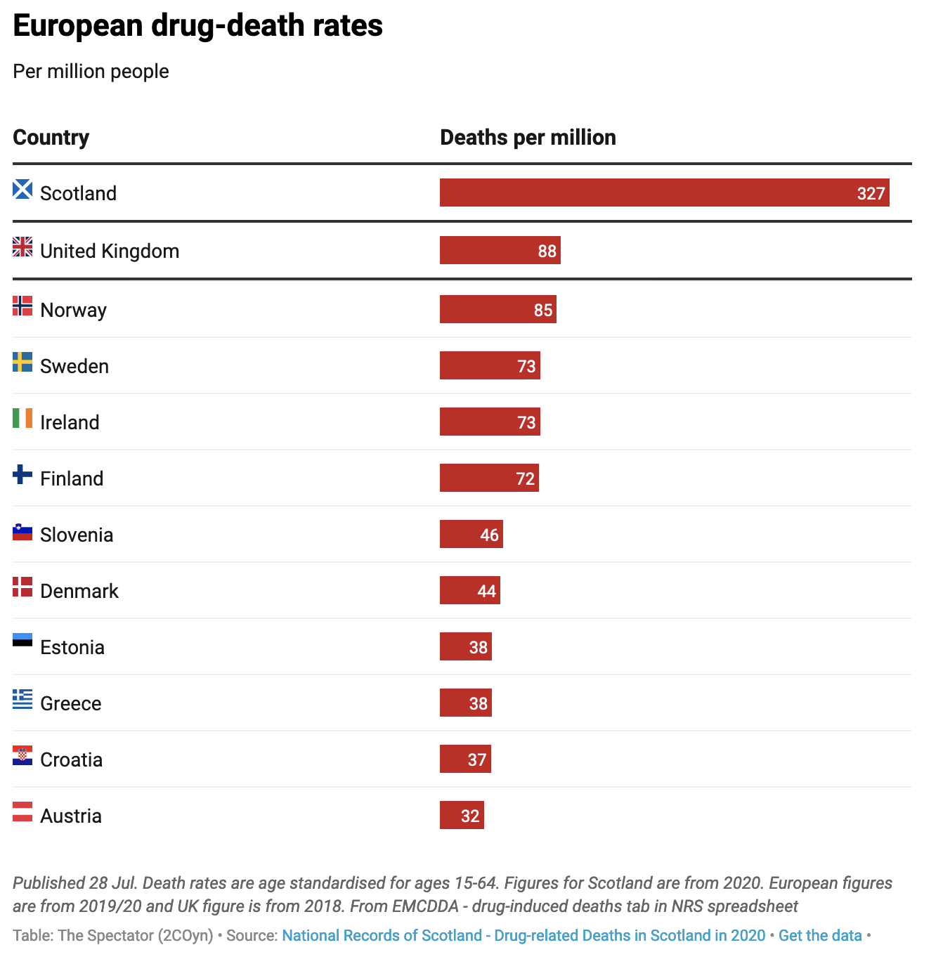 The new figures published show drug-related deaths have fallen to 1,330 – just nine fewer than the year before and the second-highest ever recorded. As a share of the population this is the worst recorded by any European country – and by some margin. It is a problem that no one seems able to solve, and speaks to the way in which Scotland seems to have incubated some of the worst deprivation in the Western world.